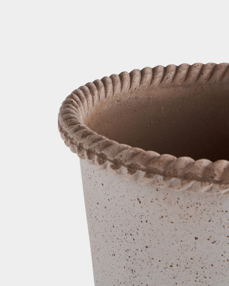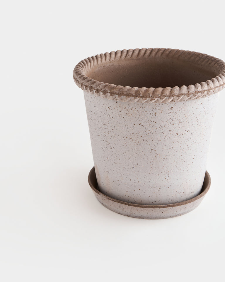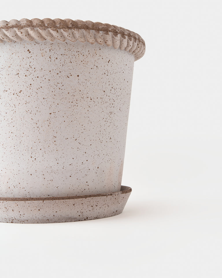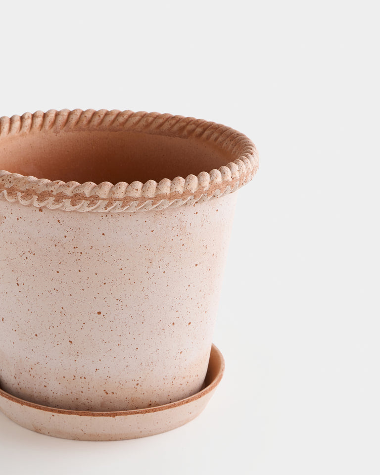 Inspired by traditional rope-patterned pots from the 1800s in Modena, Italy. Designed in Denmark and handmade in Italy from signature clay. Includes drainage hole and matching silicone-treated saucer, which is water-proof. High-fired terracotta is durable and permeable, developing a unique patina over time. Best suited to plants that prefer to dry out between waterings. Intended for indoor use. May be used outdoors seasonally (spring-fall). Not frost-proof for Canadian winters.