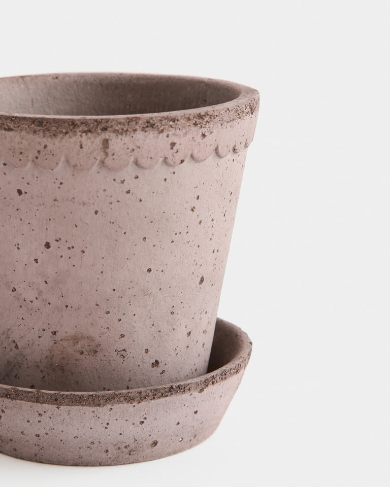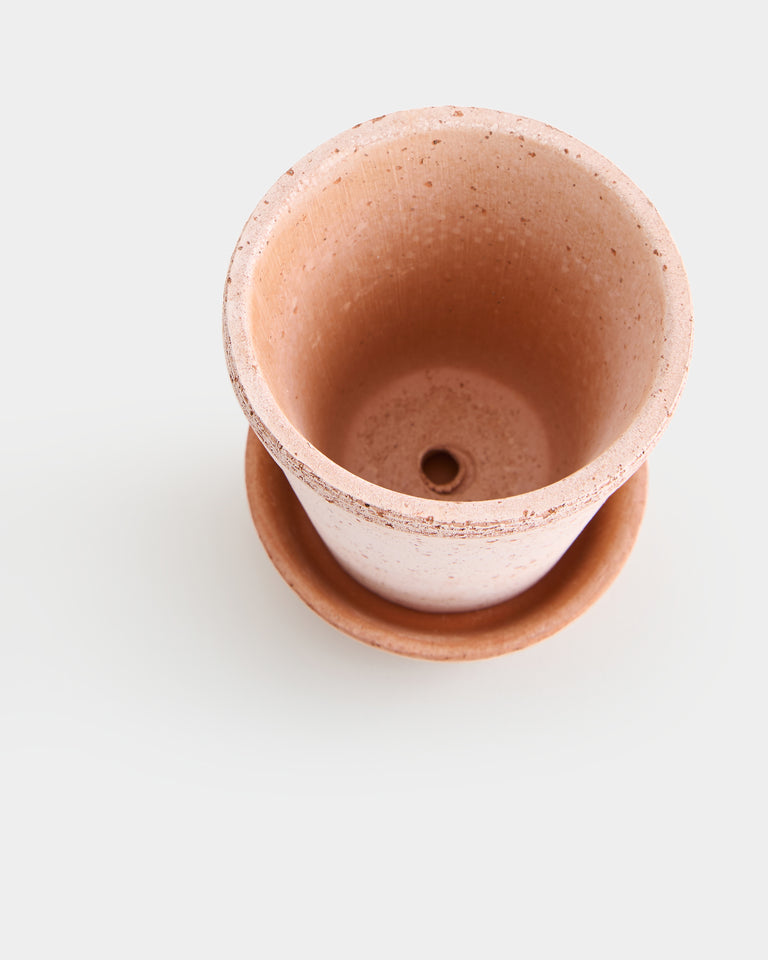 Drawn from Ancient Greek exemplars popular during the 1800s by Robert Rosso for Bergs Potter. Designed in Denmark and handmade in Italy from signature clay. Includes drainage hole and matching silicone-treated saucer, which is water-proof. High-fired terracotta is durable and permeable, developing a unique patina over time. Best suited to plants that prefer to dry out between waterings. Intended for indoor use. May be used outdoors seasonally (spring-fall). Not frost-proof for Canadian winters.