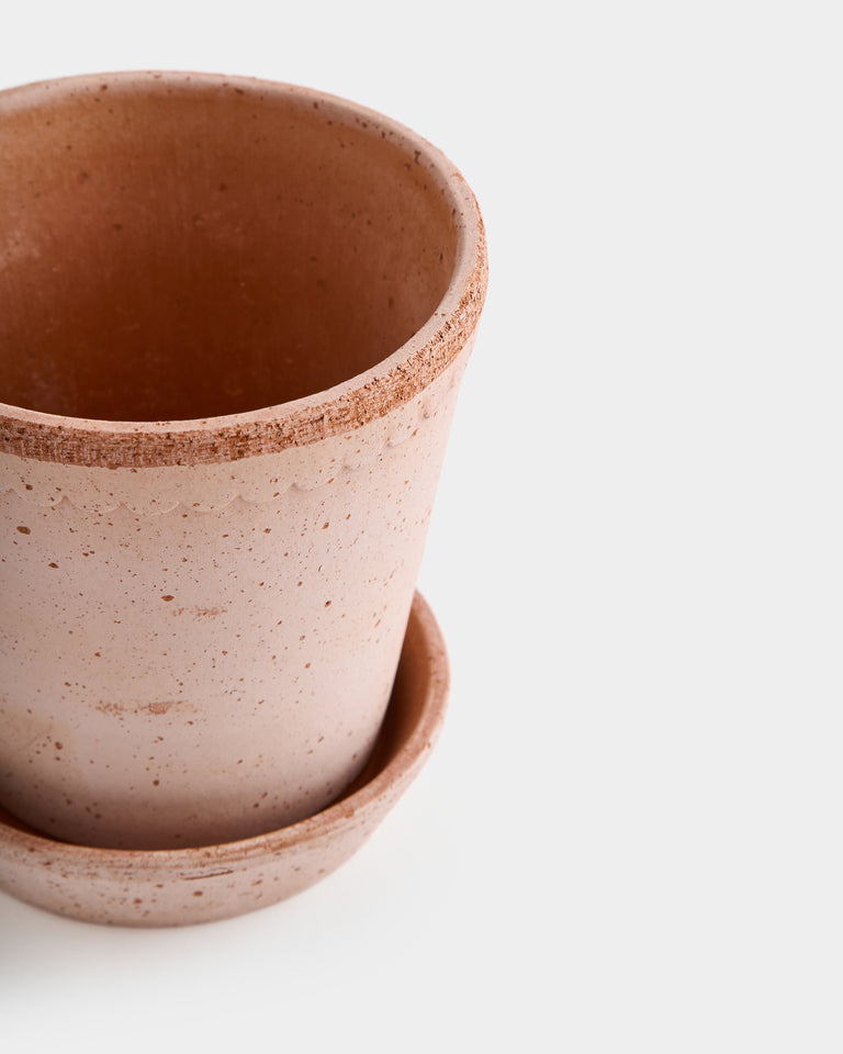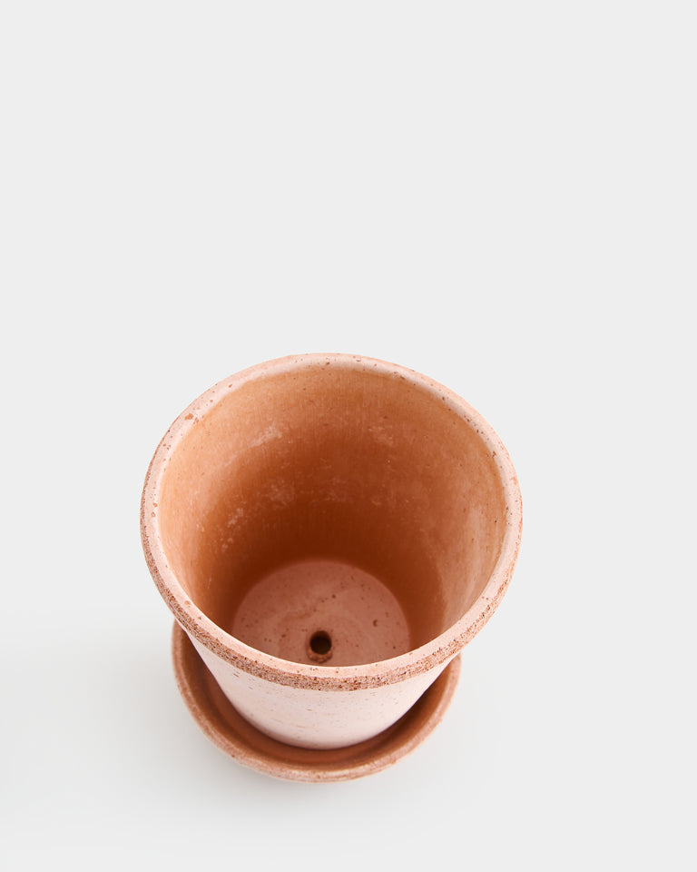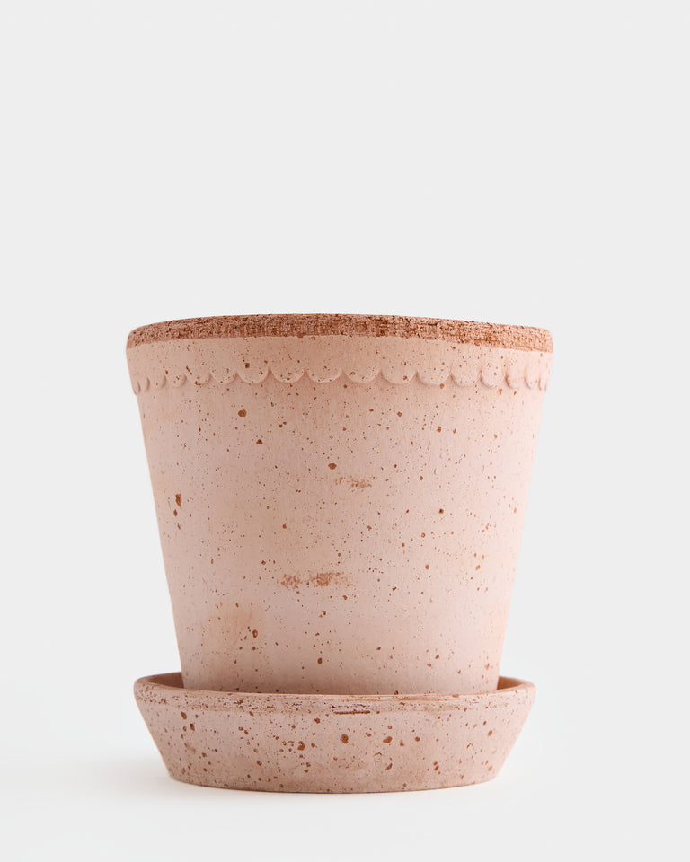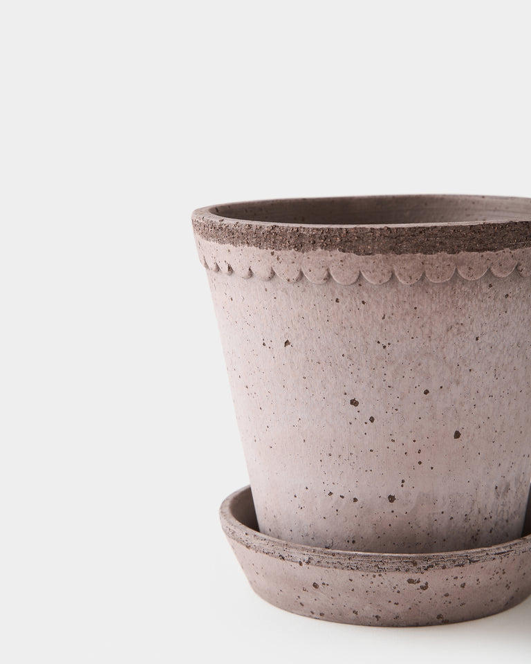 A tapered planter decorated with a subtle single scallop detail around its rim.  Drawn from Ancient Greek exemplars popular during the 1800s by Robert Rosso for Bergs Potter. Designed in Denmark and handmade in Italy from signature clay. Includes drainage hole and matching silicone-treated saucer, which is water-proof. High-fired terracotta is durable and permeable, developing a unique patina over time. Best suited to plants that prefer to dry out between waterings. Glazed earthenware is made to last and non-porous. Best suited to plants that prefer to remain moist between waterings. Intended for indoor use. May be used outdoors seasonally (spring-fall). Not frost-proof for Canadian winters.
