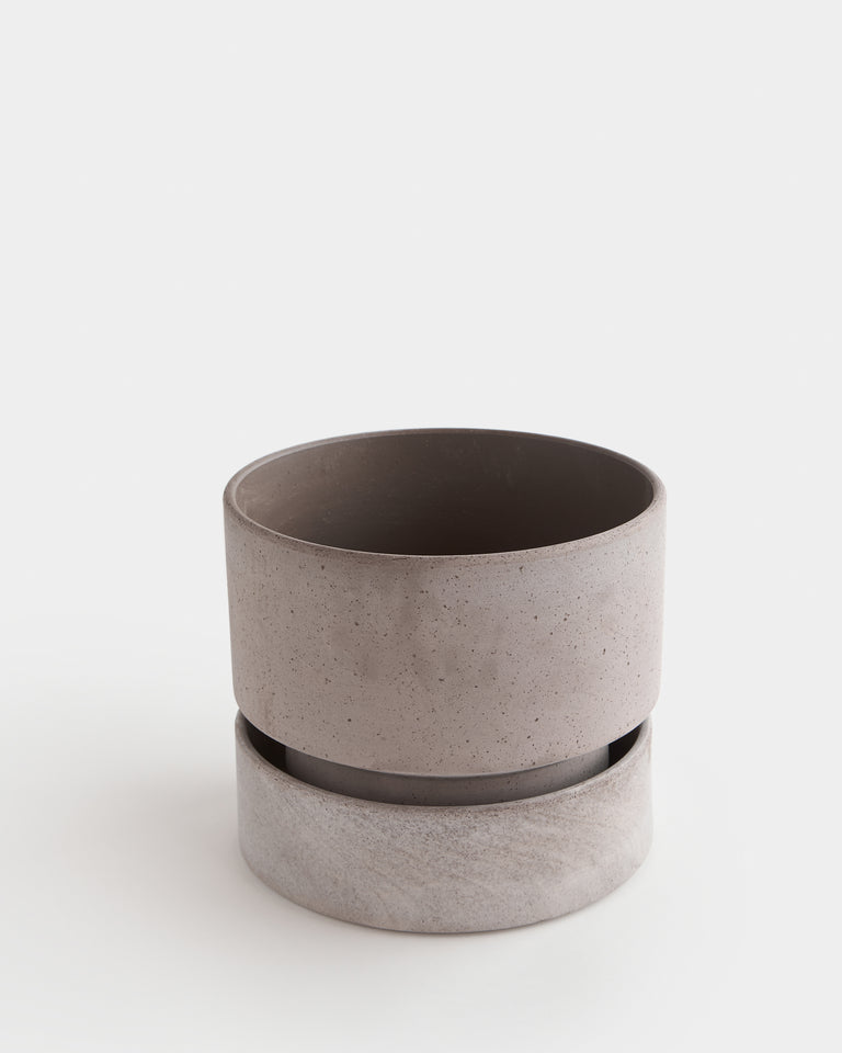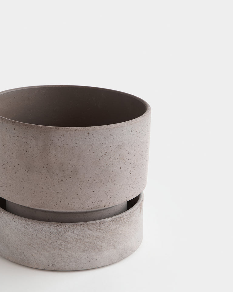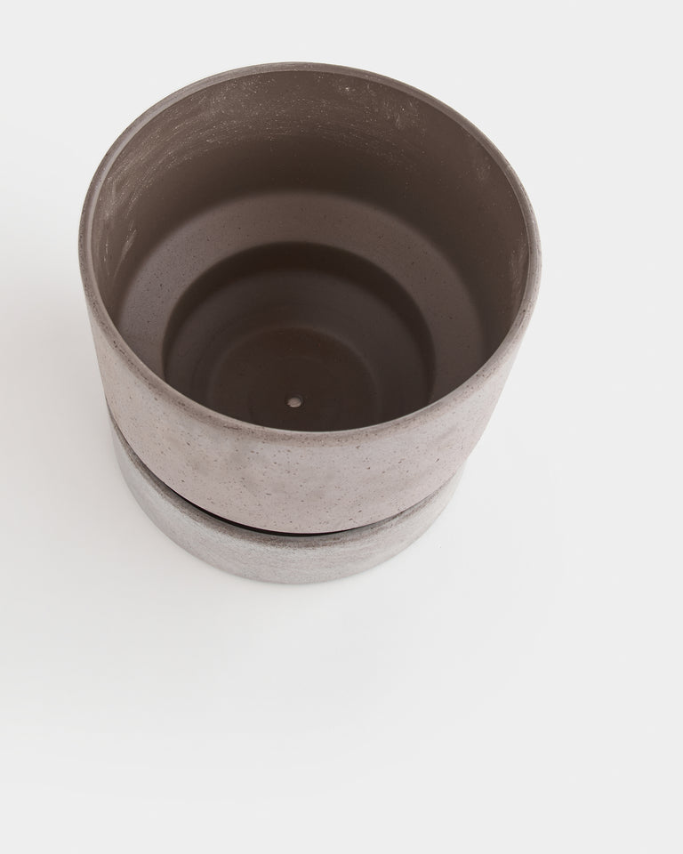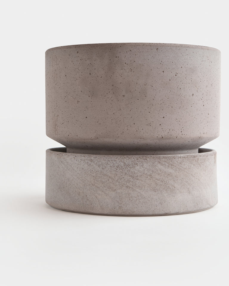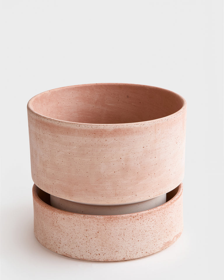 A broad and stout cylindrical planter available in matching sets of rose or grey terracotta. By Annie Hoff for Bergs Potter. Designed in Denmark and handmade in Italy from signature raw clay. Includes drainage hole and matching silicone-treated or glazed saucer, which is water-proof. High-fired terracotta is durable and permeable, developing a unique patina over time. Best suited to plants that prefer to dry out between waterings. Intended for indoor use. May be used outdoors seasonally (spring-fall). Not frost-proof for Canadian winters.