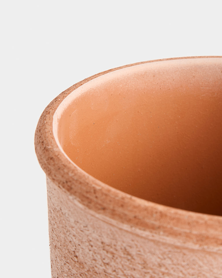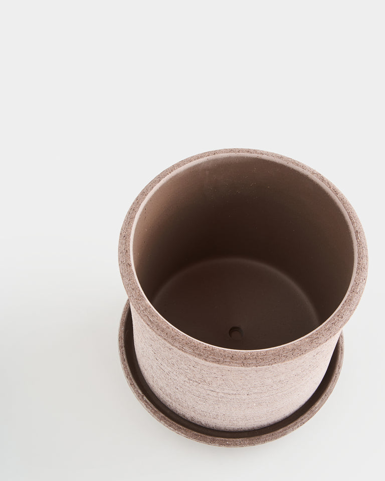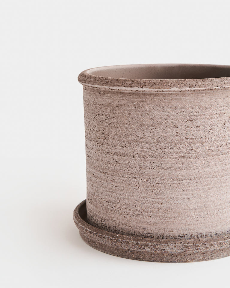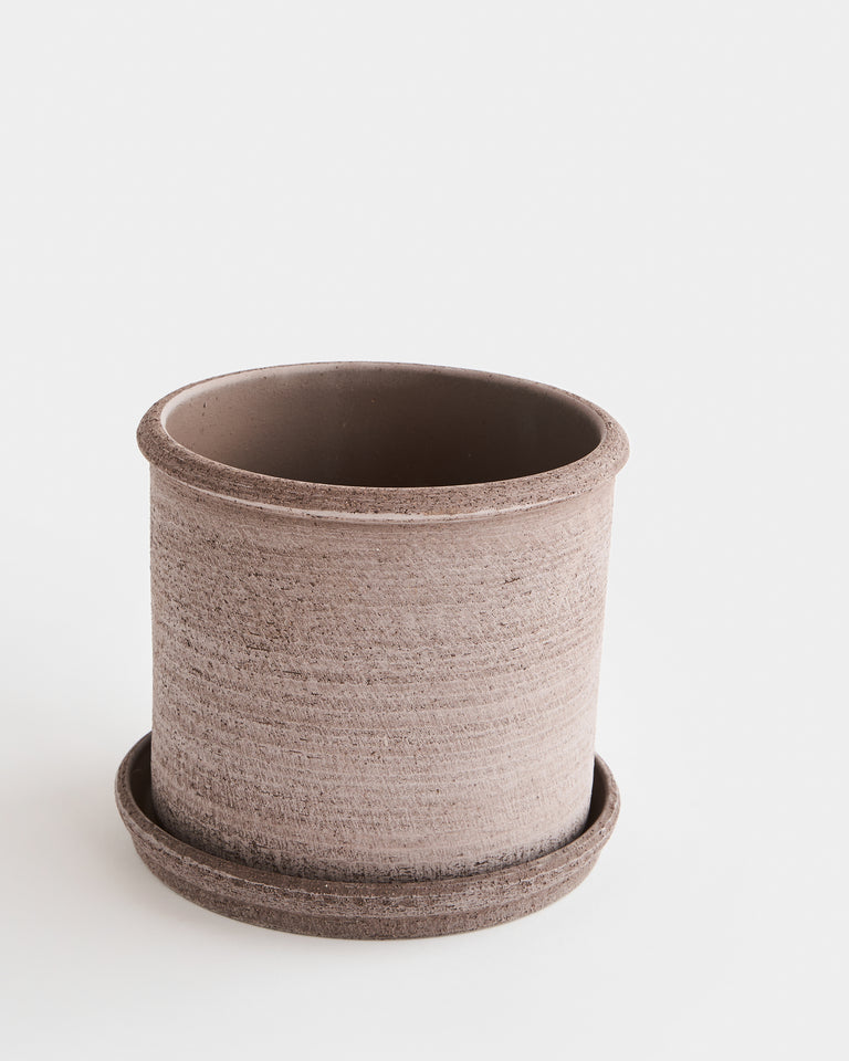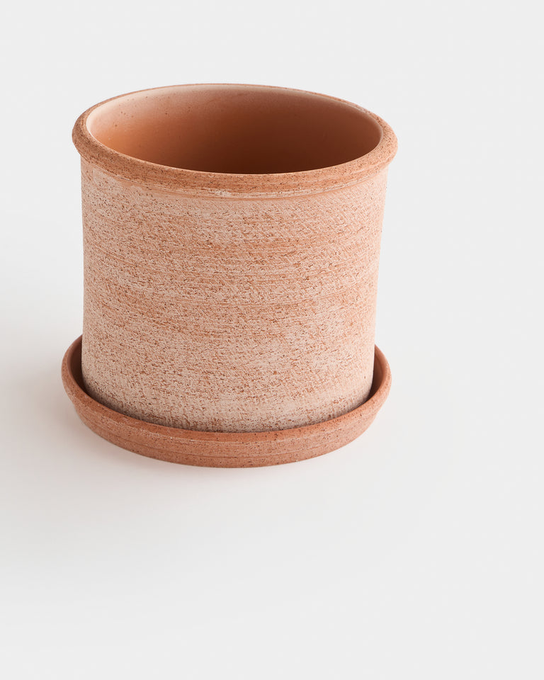 A deep cylindrical planter to house larger specimens. Designed in Denmark and handmade in Italy from signature clay. Includes drainage hole and contrasting, low-profile aluminum saucer, which is water-proof. High-fired terracotta is durable and permeable, developing a unique patina over time. Best suited to plants that prefer to dry out between waterings. Intended for indoor use. May be used outdoors seasonally (spring-fall) and stored empty in a protected spot over winter. Not frost-proof for Canadian winters.