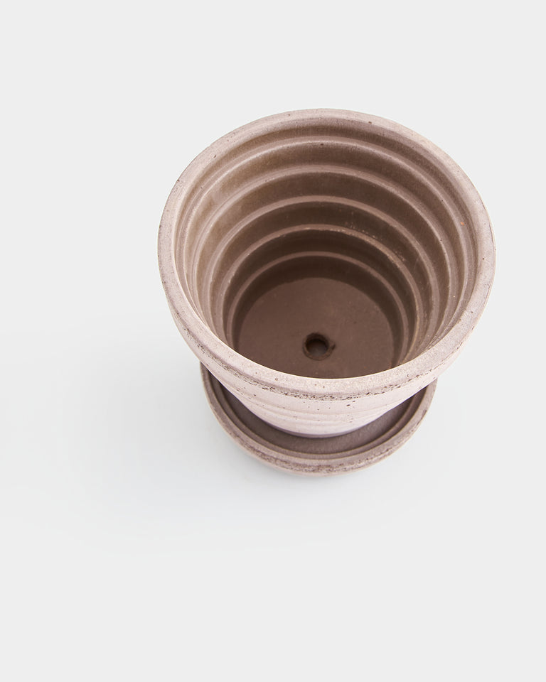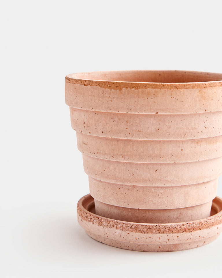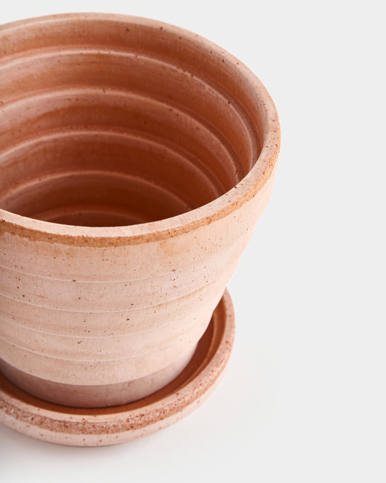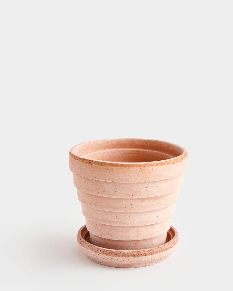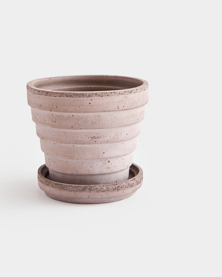 A tapered pot whose ringed pattern references the planet, Venus. Part of a larger series by Christian Buur Bangsgaard for Bergs Potter. Designed in Denmark and handmade in Italy from signature clay. Includes drainage hole and matching silicone-treated saucer, which is water-proof. High-fired terracotta is durable and permeable, developing a unique patina over time. Best suited to plants that prefer to dry out between waterings. Intended for indoor use. May be used outdoors seasonally (spring-fall). Not frost-proof for Canadian winters.