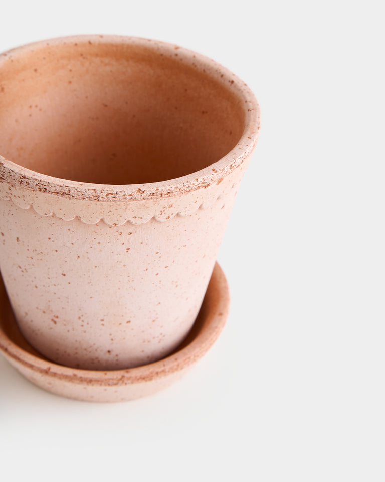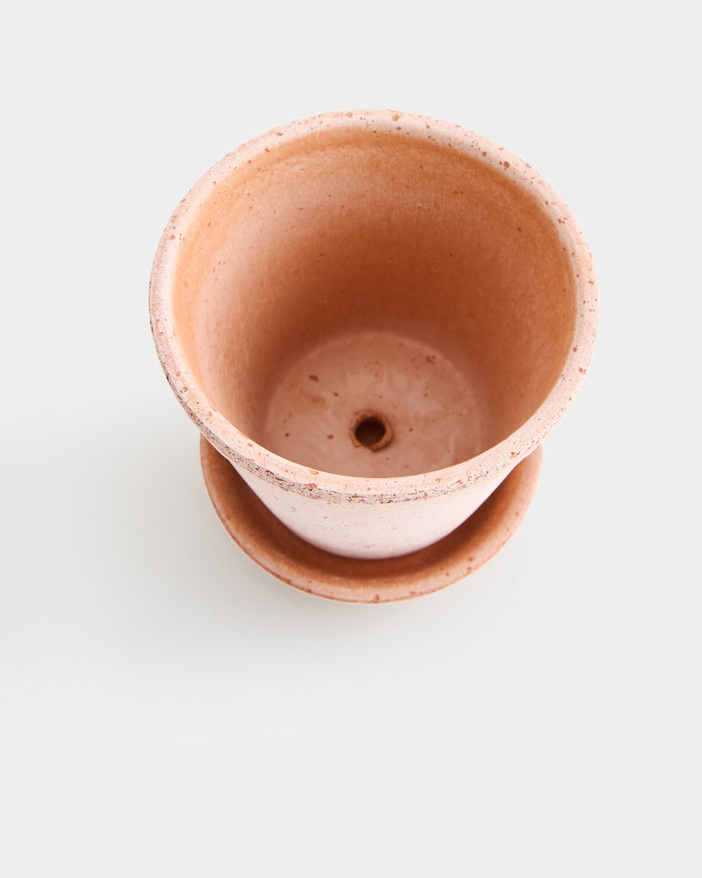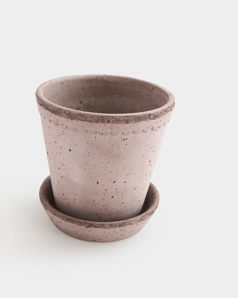 Drawn from Ancient Greek exemplars popular during the 1800s by Robert Rosso for Bergs Potter. Designed in Denmark and handmade in Italy from signature clay. Includes drainage hole and matching silicone-treated saucer, which is water-proof. High-fired terracotta is durable and permeable, developing a unique patina over time. Best suited to plants that prefer to dry out between waterings. Intended for indoor use. May be used outdoors seasonally (spring-fall). Not frost-proof for Canadian winters.