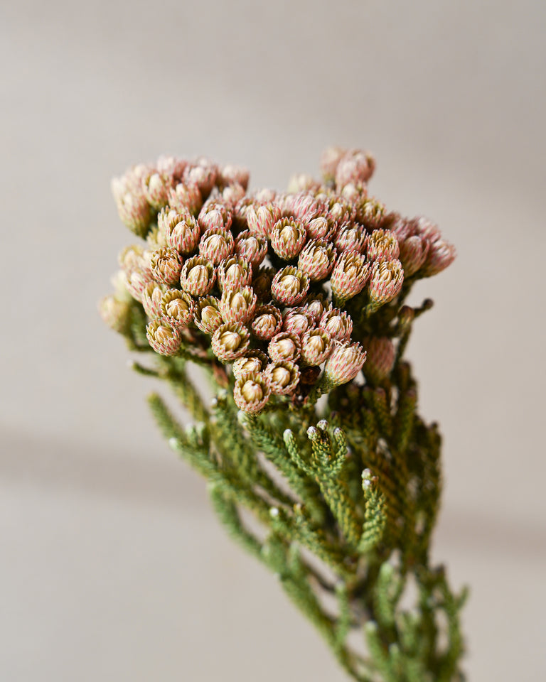A native to the cape region of South Africa, Brunia Laevis Red features branching networks of slender, coral-like woody-green foliage capped with tight, spherical clusters of flower heads. These are varied in colour — reflecting washed tones of burgundy, plum and peach. They have a beaded, almost metallic appearance and offer ample texture. They're a favourite of ours towards winter-inspired work, moody palettes, and sculptural compositions. Available as a bunch if seven (7) stems. Display en masse in a vase, or, pair with soft textural grasses or spray flowers, or voluminous dried hydrangea or foliage for contrast.