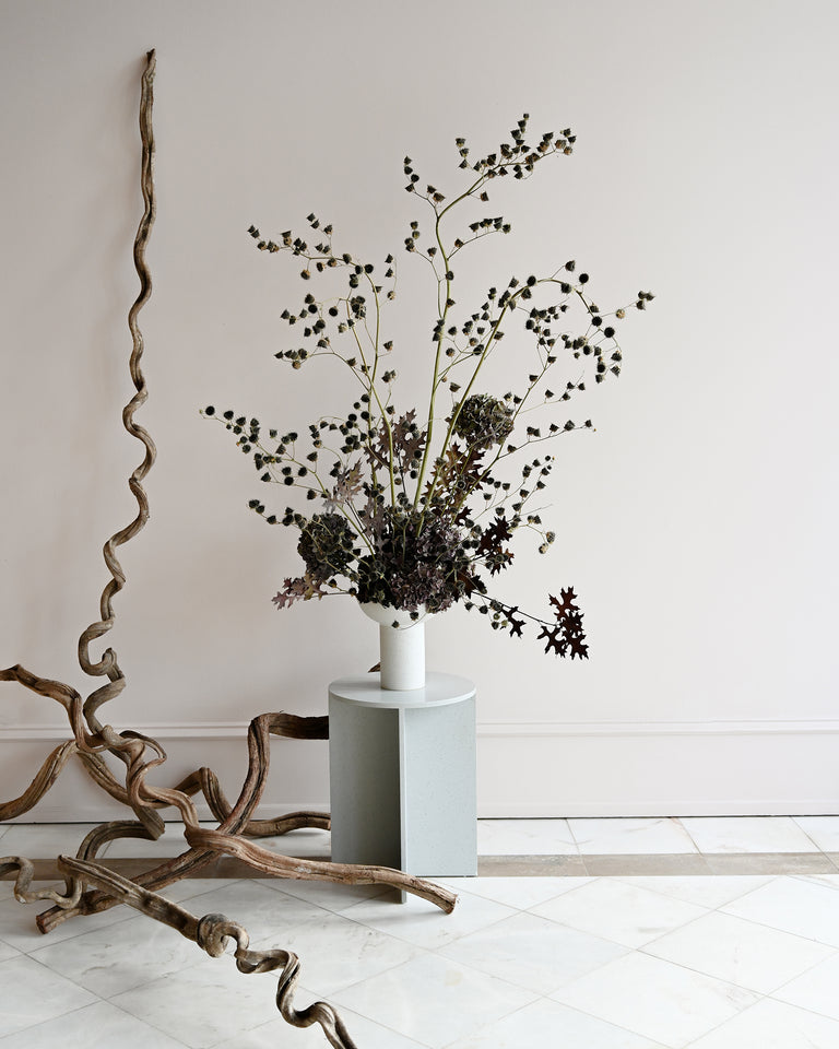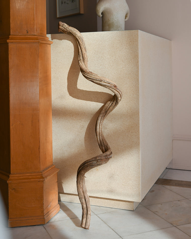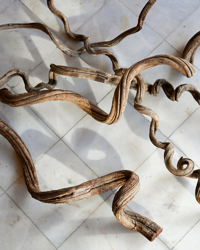 A twining, looping, woody vine forming the structural backbone of South-American tropical rainforests and in Brazil, especially. Rosca Cipo Vine has been pruned, shaped and naturally air-dried into large sculptural, sinuous and expressive cuts. Varying in thickness and surface throughout, with ridged, smooth and rugged passages. Warm, earthy colouring, from sand to honey-brown to umber. No two pieces are alike: some curl into tight, dynamic spirals; others sweep outward in gentle arcs or dramatic, elongated curves. Sold individually and available in short and tall lengths. Excels as a standalone object in a tall vessel or as a structural element woven into large dried displays.