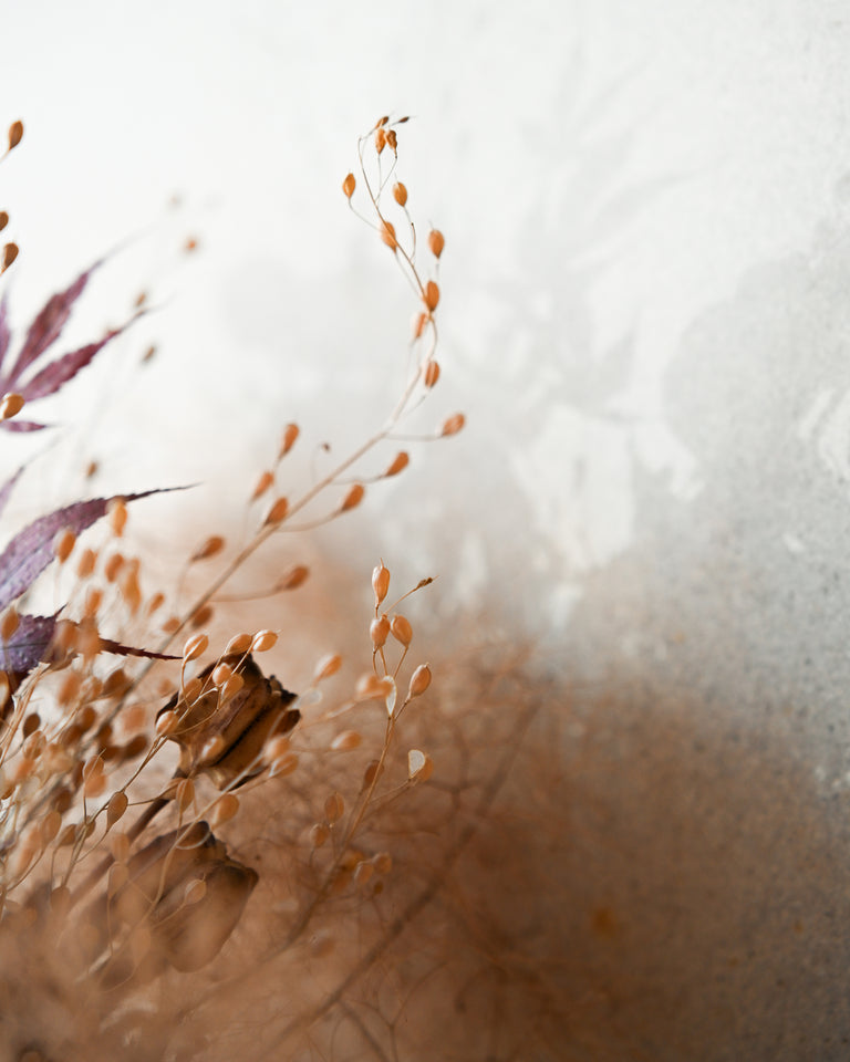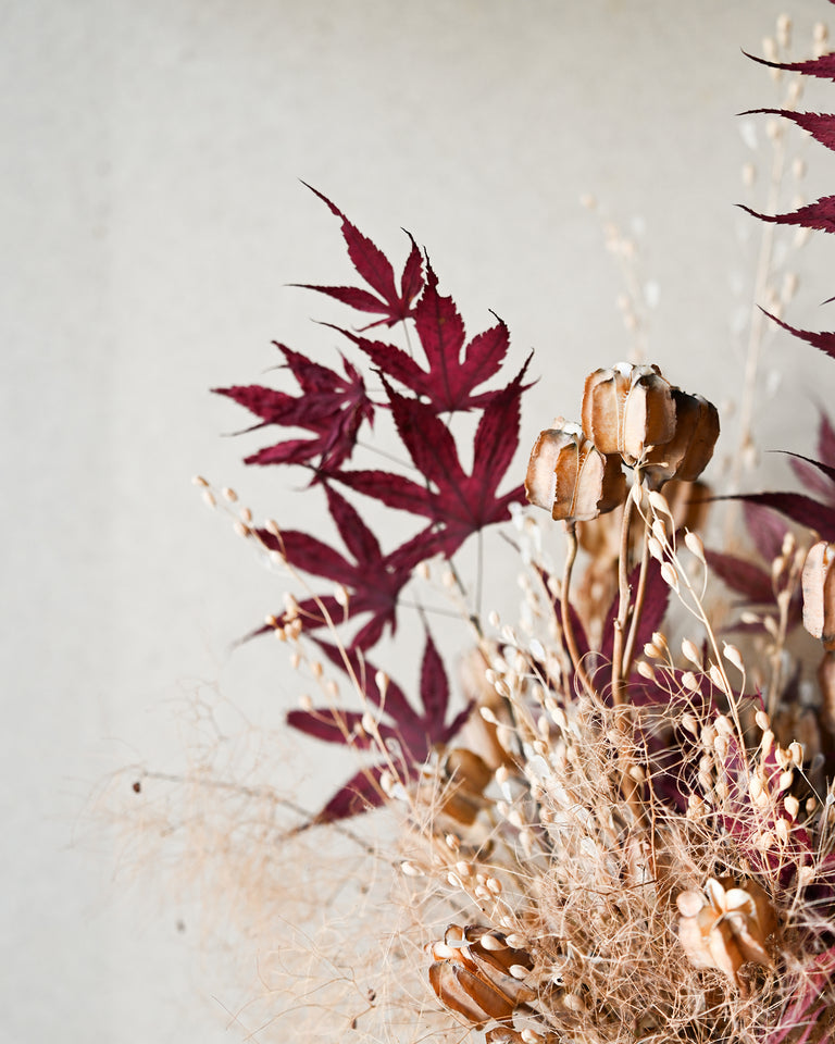 Our Dried Tumbler Arrangements are intended for those who prefer more permanent floral displays. They showcase naturally-coloured and highly textured materials, many of which we source and dry ourselves. Available in three palettes: steel, silver and bronze. Designed in an anodized aluminum Tumbler by Utilitario Mexicano. Featuring local Japanese Maple and Smoke Bush (Cotinus coggygria 'Golden Spirit'), Fritillaria Imperialis seed pods and Cress 'Attraxa' (Camelina sativa). Each design is custom-made.