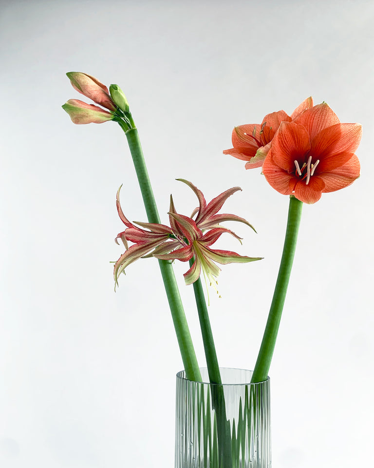 A trio (3) of mixed amaryllis stems. Magnificent flowers with silken pointy petals on substantial fleshy stems. Provided in bud stage, these open and unfurl over a period of a week or two, revealing a riot of colour and stripes, in some cases. Amaryllis varieties may include: Bouquet, Green Magic, Tarantula or Merenque. Keep stems long or cut them short to suit any vase(s). Gift-wrapped with hydration.