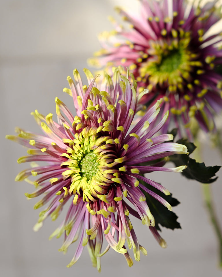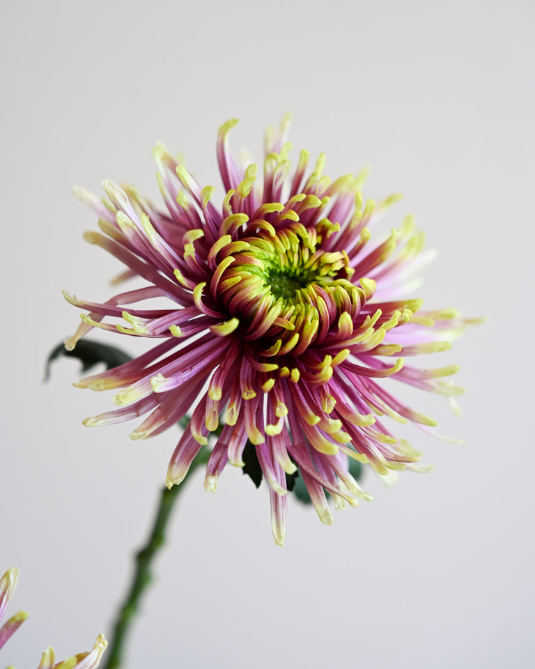 A statement flower with a complex form, neon and graded colouring, impressive size and long vase-life. Chrysanthemum 'Balthazar' features a dramatic burst of petals concealing a small, button-like centre. Petals are long, fine, tubular and slightly twisted; they shift in tone from deep garnet or burgundy (base) to neon green (middle) to rose (at their tips). Their form is spidery — akin to fireworks. As flowers mature, petals extend outward and downward, adding fullness and creating a round, almost spherical shape. Large heads (2-5" in Ø) on tall, sturdy stems. Available as a five-stem bunch. Arrange en masse or mix with other chrysanthemums or textural materials for a quirky yet elegant display.