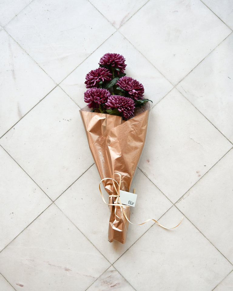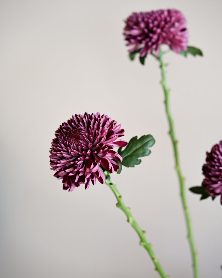 Luxuriously-coloured, sculptural and ten times the size of regular varieties, Chrysanthemum 'Bigoudi Red' is much adored — and for good reason. Featuring dense, sculptural spheres of firm, directional petals radiating from a golden centre and spanning up to 10 cm! Button shape and whorling petal formation sustain interest up close. Velvety red petals sport bronze undertones, which catch the light. Available as a bunch of five (5) stems of varying lengths. Adds mass, structure and punctuation to any design, though we love them cut low and kept close in a vase on their own. Exceptional vase life! Form opens and colour softens over time. Display en masse or mix with other textural materials for a truly opulent effect.