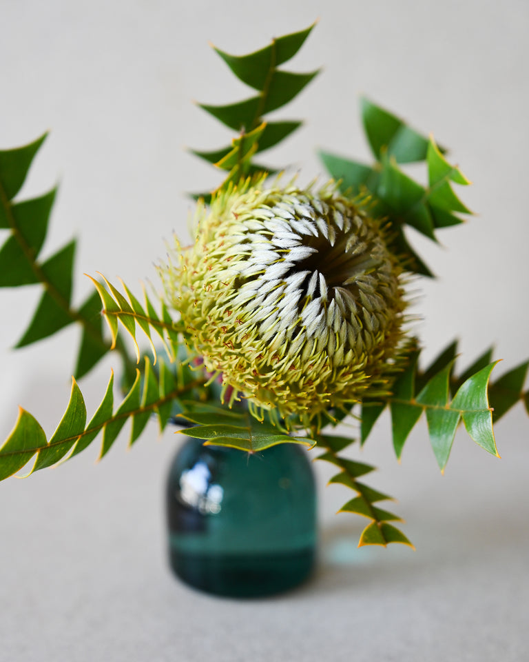 Our Gather Vase Solo / E features the finest seasonal materials arranged in our Gather Vase E designed by Sam Anderson. Available in clear, grey or green borosilicate glass. Each design is custom-made. Palette is designer's choice. Materials vary daily and according to the seasons. Order up to four weeks in advance.
