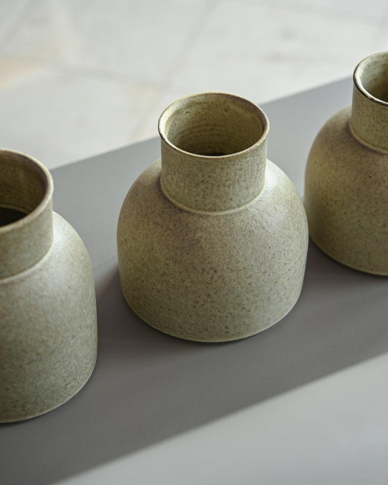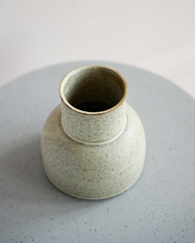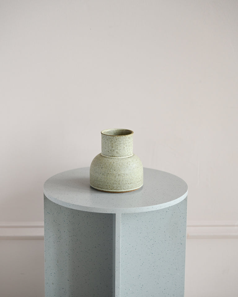 A substantial vase consisting of a domed body with flat-bottomed base and a columnar neck. Made from red-coloured stoneware from Italy. Intentionally textured surface has been dipped in a jade glaze to achieve speckled, rustic and always luminous results. Soft drips and subtle striations apparent on the mouth, joints and curvatures. Satin finish throughout. One of a kind and handmade by Alissa Coe. Wheel-thrown. Watertight.
