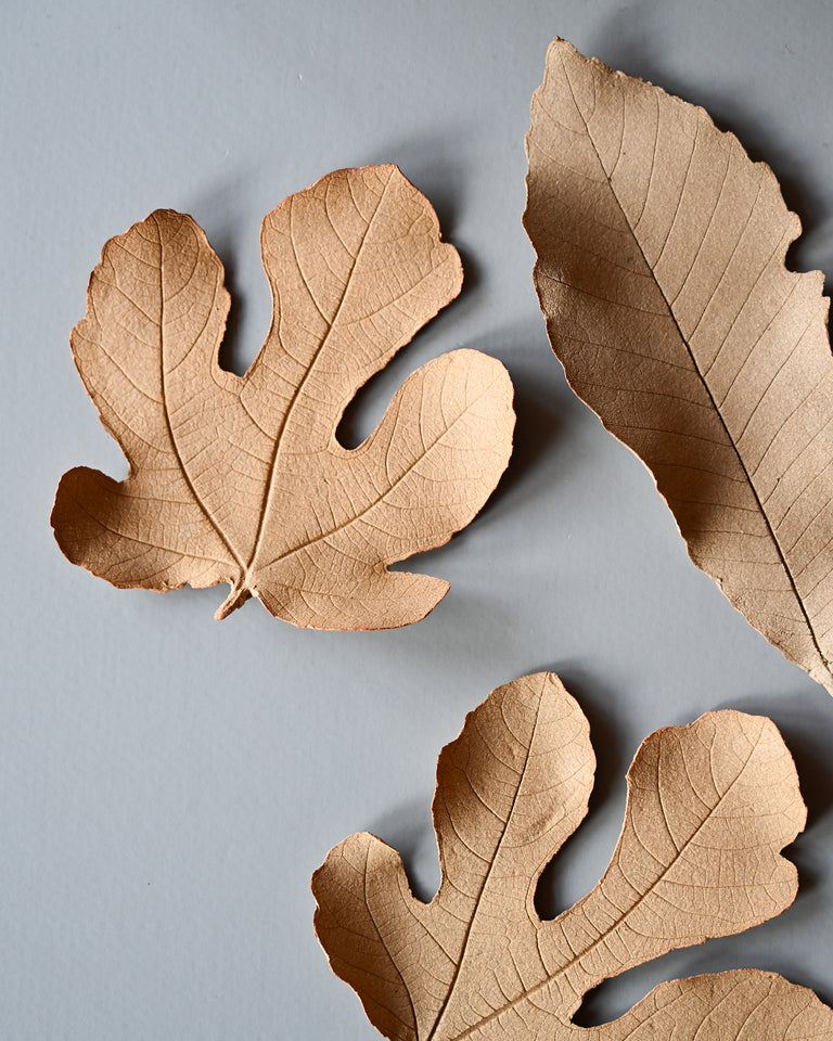 Charming sculptures for surface or wall-mounted display. Derived from fig leaves gleaned by the artist on walks near her home and studio. Made from red-coloured stoneware from Italy. Intentionally textured surface features a unique one-sided impression and feathered edges. Magnet set provided separately or pre-installed upon request. One of a kind and handmade by Alissa Coe.