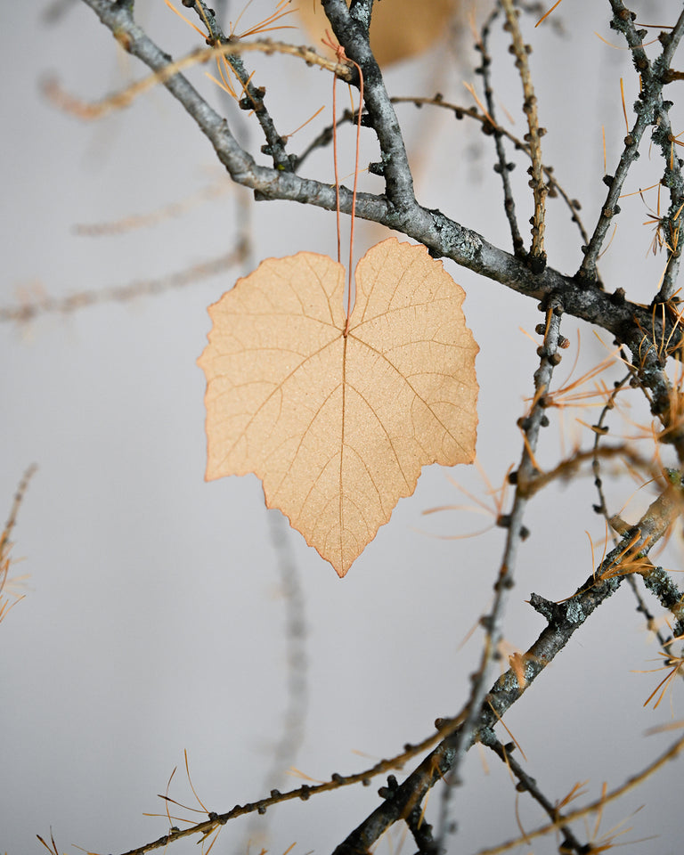Holiday ornaments derived from grape leaves gleaned by the artist on walks near her home and studio. Made from red-coloured stoneware from Italy. Intentionally textured surface features a one-sided impression and softened edges. Includes hole and knotted loop of Italian leather for suspended display. Two (2) oak leaf ornaments available, each one of a kind and handmade by Alissa Coe.