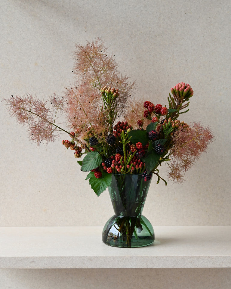 Our Gather Vase Solo / B features the finest seasonal materials arranged in our Gather Vase B designed by Sam Anderson. Available in clear, grey or green borosilicate glass. Each design is custom-made. Palette is designer's choice. Materials vary daily and according to the seasons. Order up to four weeks in advance.