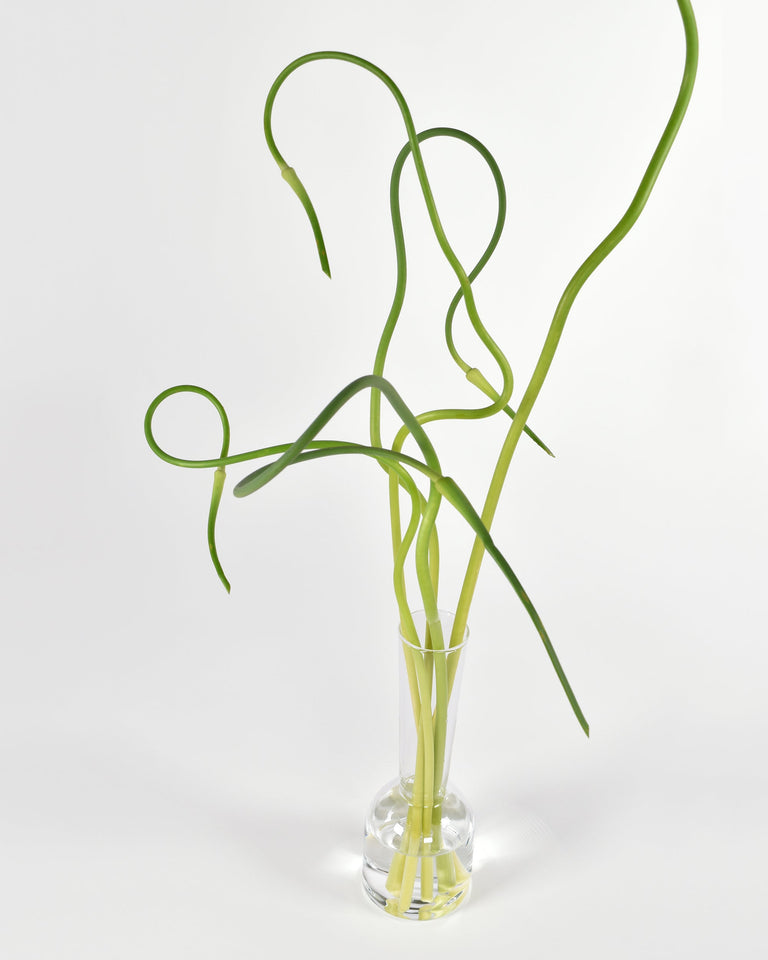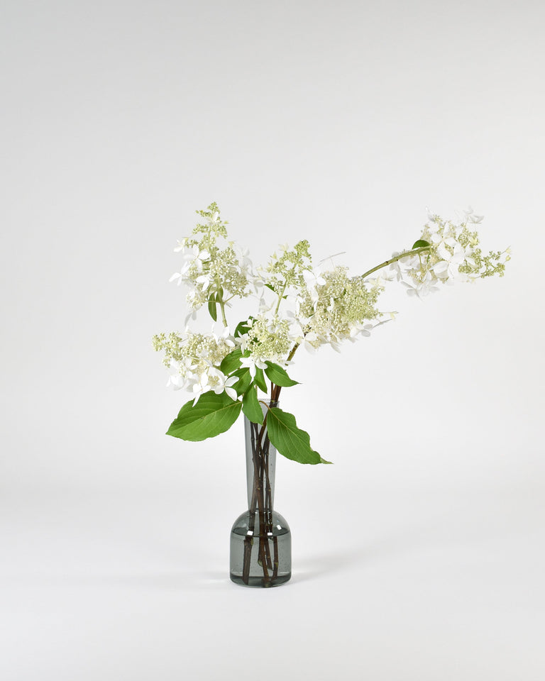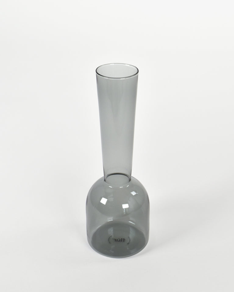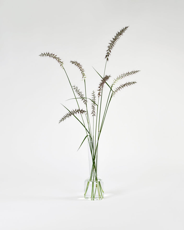 A tall, elegant bud vase with a narrow footprint. One of five (5) contemporary forms produced in collaboration with designer Sam Anderson and exclusive to Flùr. Handmade from lightweight, shatter-resistant borosilicate glass. Available in clear and grey.
