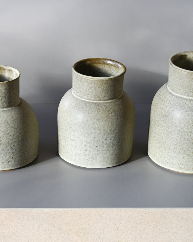 A substantial vase consisting of a domed body with flat-bottomed base and a columnar neck. Made from red-coloured stoneware from Italy. Intentionally textured surface has been dipped in a jade glaze to achieve speckled, rustic and always luminous results. Soft drips and subtle striations apparent on the mouth, joints and curvatures. Satin finish throughout. One of a kind and handmade by Alissa Coe. Wheel-thrown. Watertight.