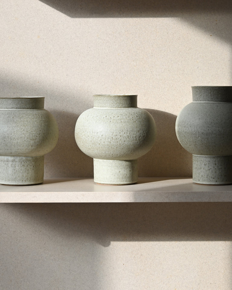 A substantial vase consisting of a round body and pronounced columnar foot and neck. Made from red-coloured stoneware from Italy. Intentionally textured surface has been dipped in a jade glaze to achieve speckled, rustic and always luminous results. Soft drips and subtle striations apparent on the mouth, joints and curvatures. Satin finish throughout. One of a kind and handmade by Alissa Coe. Wheel-thrown. Watertight.