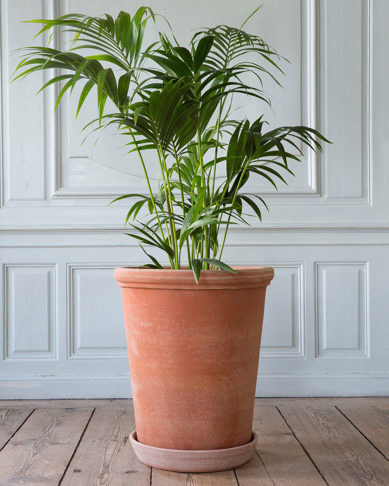 Introducing the next generation of planters from Bergs Potter! Impressive, monumental terracotta pots with matching saucers for large indoor plants or seasonal outdoor garden displays. Available in two raw finishes and two nested sizes — 50 cm / 18.5" and 60 cm (tall) / 21.5". Includes complimentary set of large triangle planter supports in a matching raw finish. Features a tall, broad, tapered form with a pronounced rim. Named after the Roman goddess (of plants, flowers and fertility), the collection is also a nod to the 18th century Danish encyclopedia of botany (Flora Danica). Designed in Denmark and handmade in Italy from signature clay. Includes drainage hole and matching silicone-treated saucer, which is water-proof. High-fired terracotta is durable and permeable, developing a unique patina over time. Best suited to plants that prefer to dry out between waterings. Intended for indoor use. May be used outdoors seasonally (spring-fall) and stored empty in a protected spot over winter. Not frost-proof for Canadian winters.