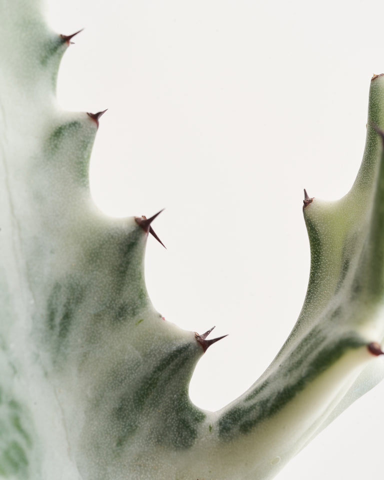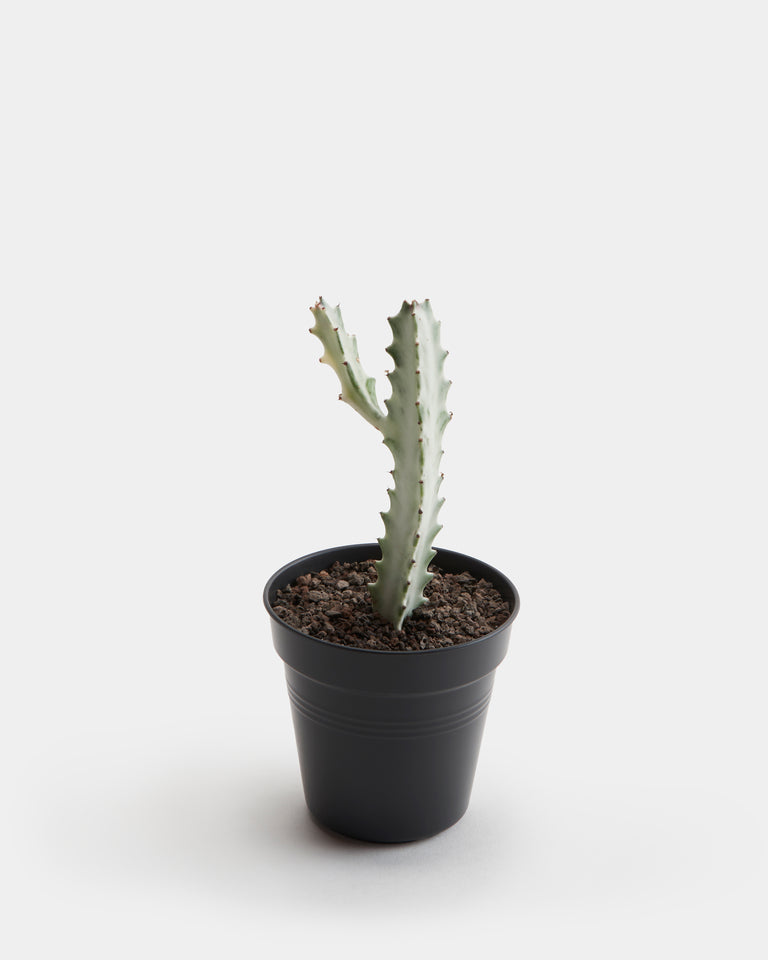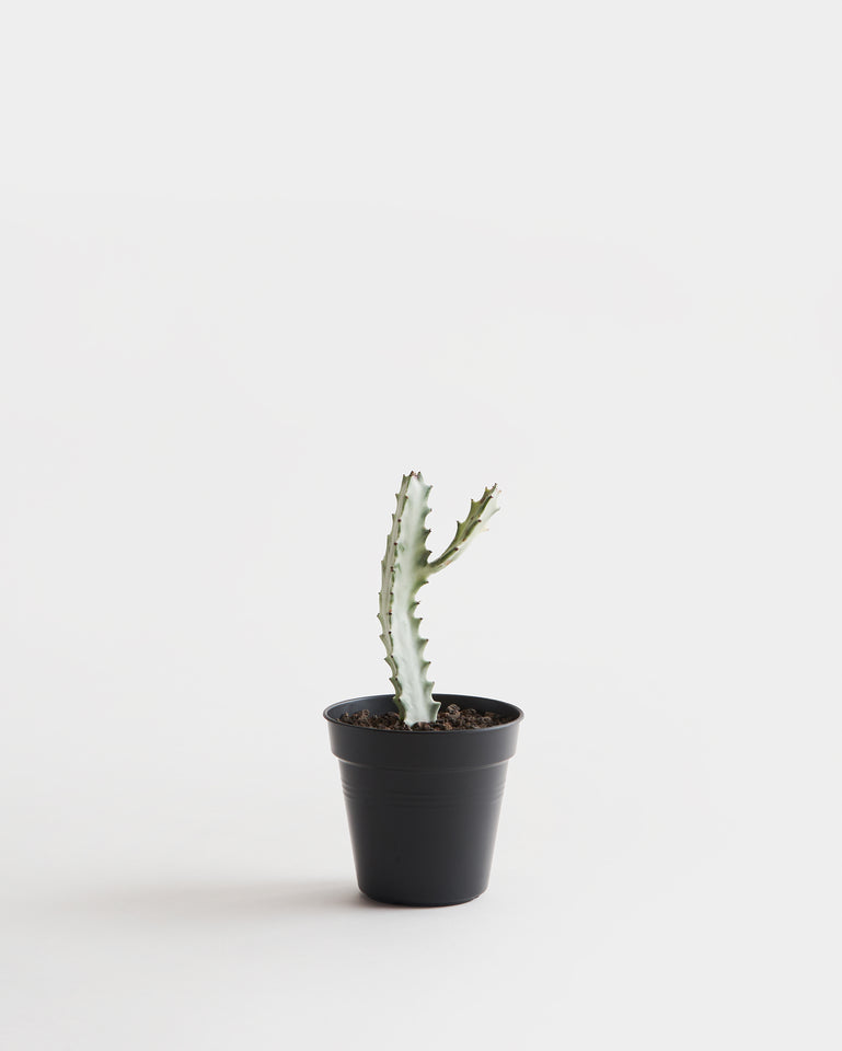 An unusual and immature specimen. Commonly known as "White Ghost" or "Milkstripe Euphorbia," and a cultivar of Euphorbia Lactea. Slow-growing, nearly-white and usually leafless. Consists of a freely branching network of upright, triangular stems with thorny ridges. Resembles a dense candelabra in maturity yet remains relatively short when grown indoors (up to 2'). Creamy white to yellow flesh contains little to no chlorophyll. Best suited to a spot with bright direct light, planted in any small-sized planter by Bergs Potter. Looks — and is — sharp! Contains a toxic, milky sap!Place beyond reach of small children and pets.