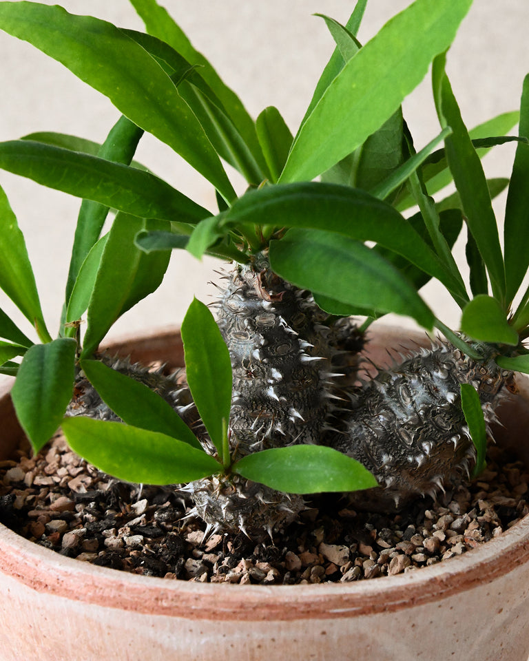A charming, collectible hybrid that reflects the best traits of both parents: the sprawling habit of 'E. parvimedusae' and the thorny character plus colourful bracts of Crown of Thorns 'E. milii'. Very slow growing and compact. Plant's central caudex gives rise to multiple, twisting arms that radiate outward, each lined with short, sharp spines. Mature specimens develop into dense, coral-like mounds measuring 6-12" tall and 10-15" wide. Clusters of glossy green leaves appear on new growth tips and along growing stem segments. Oval, thin, soft and somewhat fleshy, these leaves are exuberant but deciduous, dropping at the onset of seasonal dormancy or drought. Small yellowish-green flowers (cyathia) may appear on younger stem tips throughout the year; however flowering is rare in cultivation. Best suited to a spot with bright indirect light and moderate direct sun (i.e., morning or late in the day). Avoid harsh midday direct sunlight, which can scorch new growth. Potted in a Julie Planter 12 cm / 4.25" by Bergs Potter. Contains a toxic, milky sap! Place beyond reach of small children and pets.
