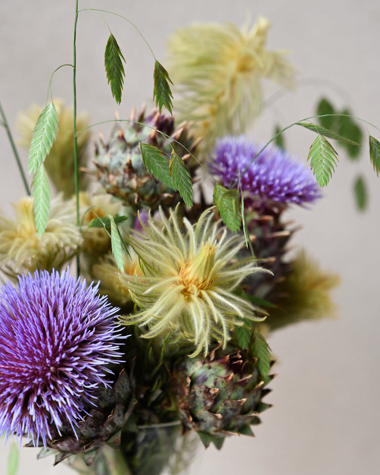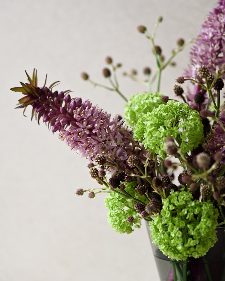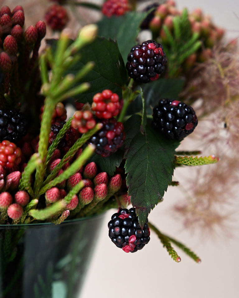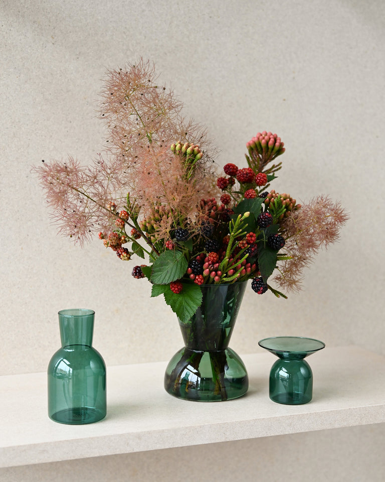 Our Gather Vase Solo / B features the finest seasonal materials arranged in our Gather Vase B designed by Sam Anderson. Available in clear, grey or green borosilicate glass. Each design is custom-made. Palette is designer's choice. Materials vary daily and according to the seasons. Order up to four weeks in advance.