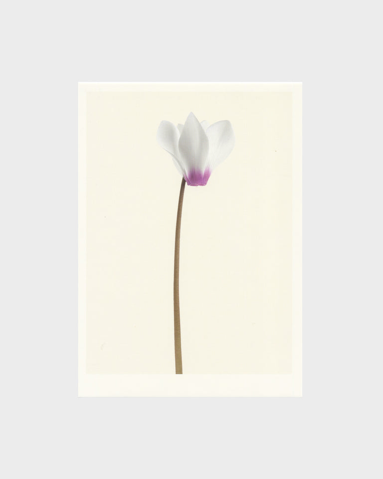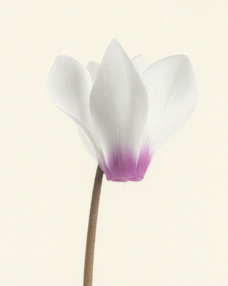 An exquisitely detailed portrait of a white cyclamen bloom.