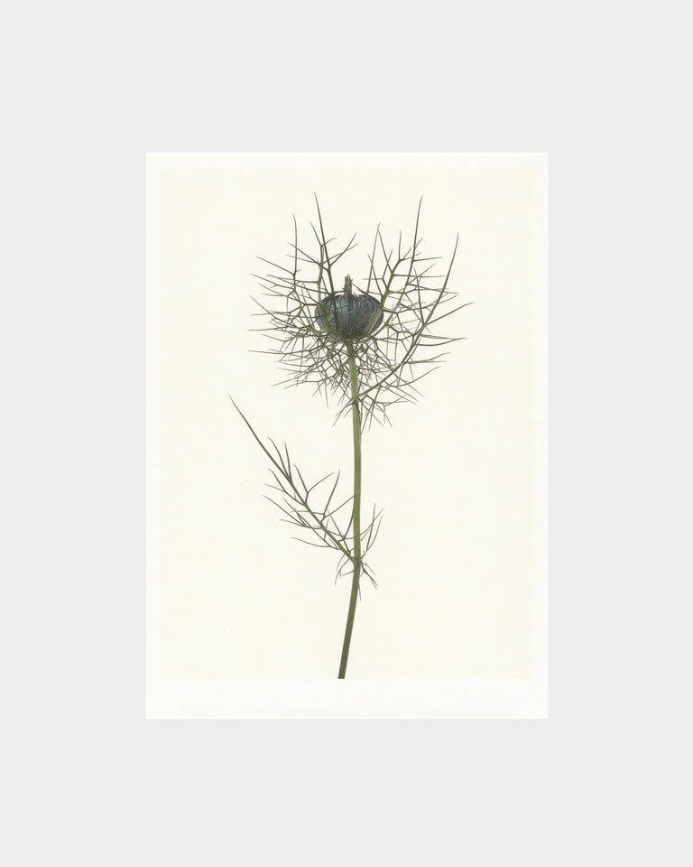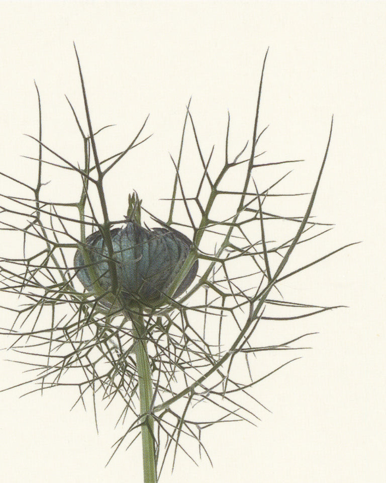An exquisitely detailed botanical portrait of blue love-in-a-mist.