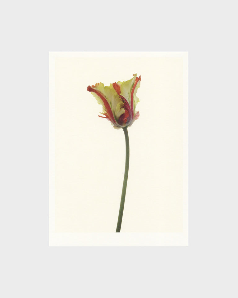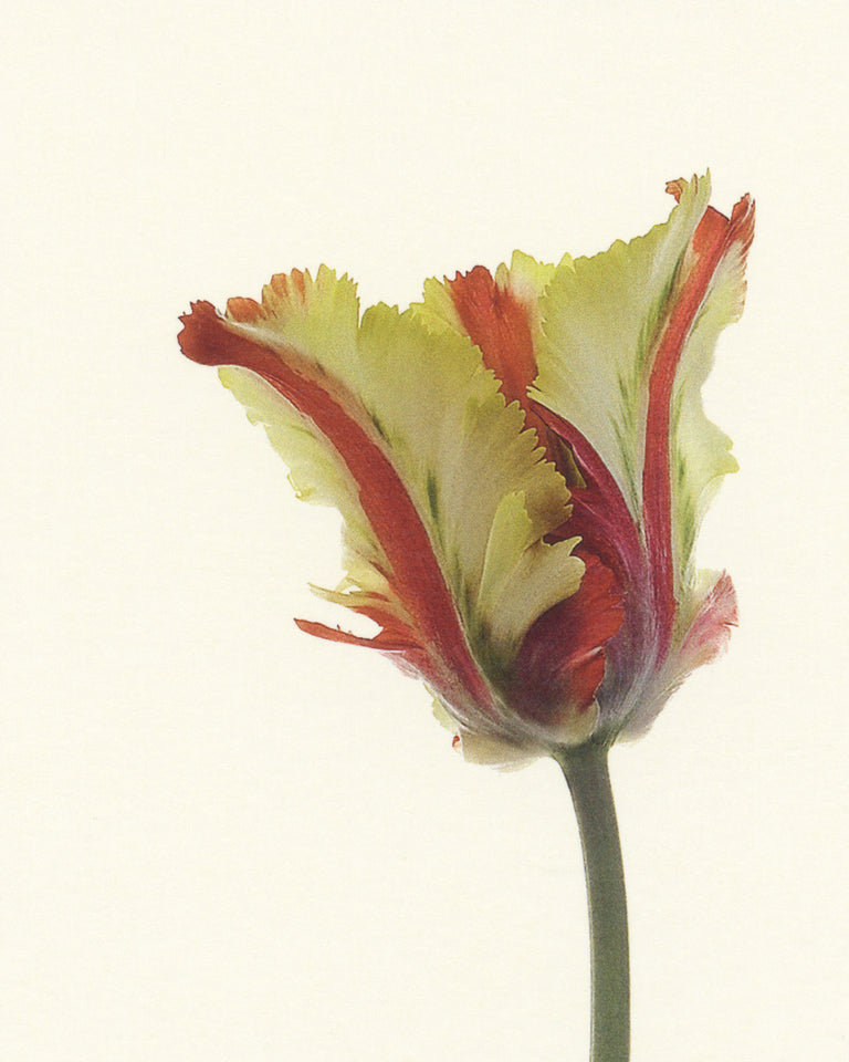 An exquisitely detailed portrait of a variegated parrot tulip stem (Tulipa 'Flaming Parrot').