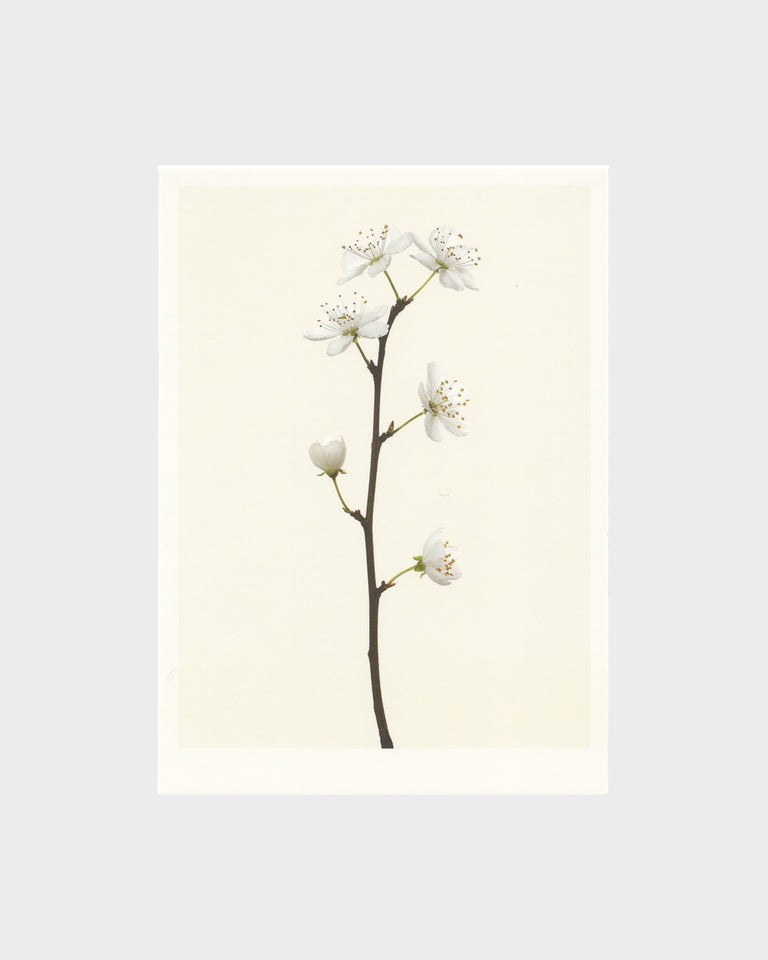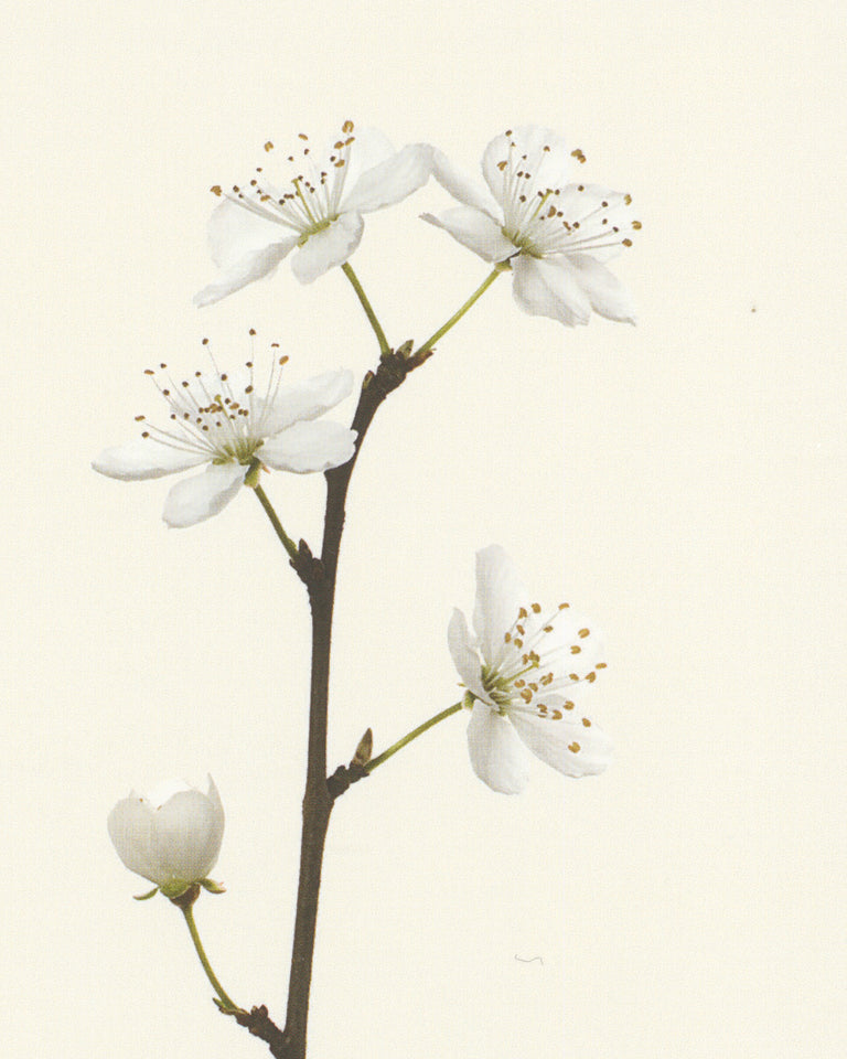 An exquisitely detailed portrait of a flowering plum branch (Prunus).