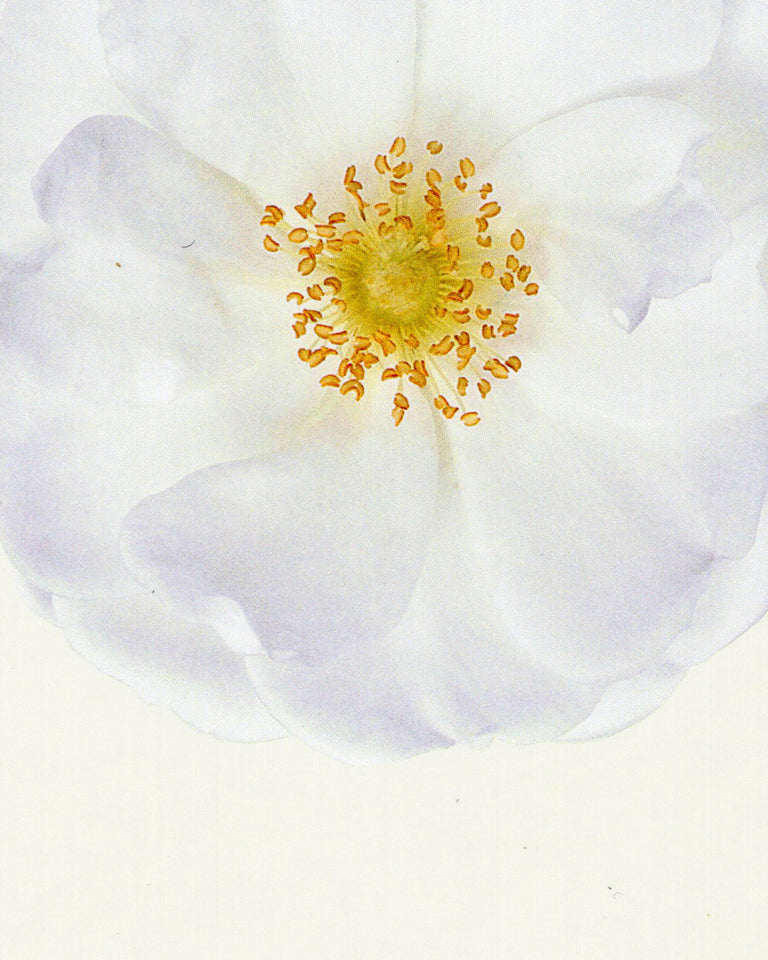 An exquisitely detailed botanical portrait of a white flowering rose flower (Rosa 'Schneeflocke').