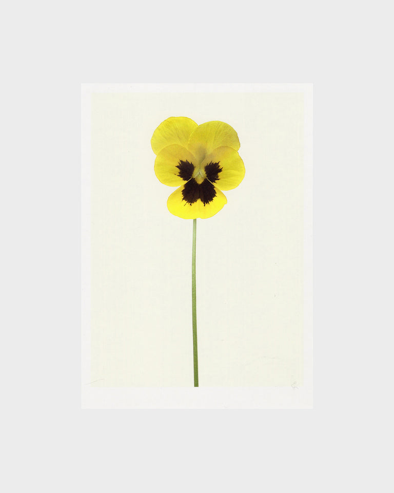 An exquisitely detailed portrait of a yellow pansy flower (Viola cornuta).