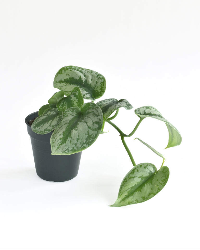 A tenacious plant with eye-catching foliage. Large, heart-shaped leaves are matte green and splashed in iridescent silver. They curl inwards when the plant is thirsty. Commonly known as Philodendron Silver or Satin Pothos, while belonging to neither species. Mature vines climb trees to considerable heights in the wild and may benefit from supports indoors. Prefers bright indirect to filtered sunlight. Tolerates low light however leaf variegation diminishes in these circumstances. Sensitive to cold. Best suited to any of our small tabletop planters by Bergs Potter.