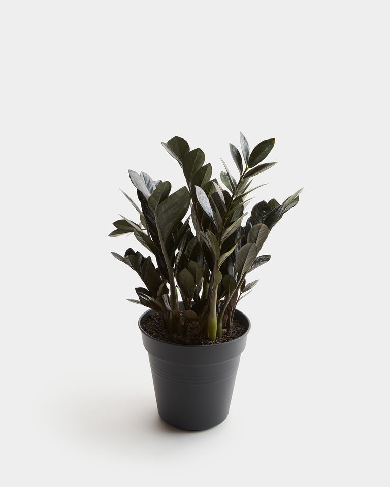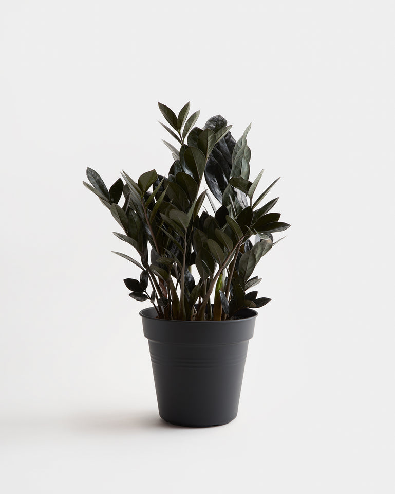 An upright, rhizomatous plant with glossy-black foliage. This cultivar was first developed and introduced in South Korea in the early 2010s. It's been wildly popular, ever since. One of the hardiest indoor plants, tolerating lower light conditions and periods of drought. Contrasts wonderfully against other plants. Featuring thick, glossy, pinnate leaves on arching petioles. New growth emerges bright green but assumes a dramatic inky finish over time. Mature specimens typically achieve 1-2' wide and 2-3' tall indoors, composed of a dense colony of offsets and assuming a dramatic vase shape. Small pale spadix flowers are a rare occurrence indoors. Suitable for a tabletop or shelf in bright filtered or indirect sunlight, potted in any medium tabletop planter from Bergs Potter.